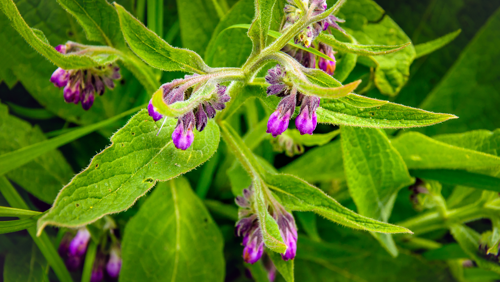 - Musculoskeletal System: Comfrey’s anti-inflammatory and analgesic properties make it a good topical choice for musculoskeletal pain. It is effective topically for strains, sprains, bruises, arthritis, and the pain of gout. The chemical allantoin in comfrey markedly accelerates cell division rates among fibroblasts, chondroblasts, and osteoblasts, decreasing the healing time of tissue, cartilage, and bones. Allantoin is highly penetrating, so even topical application can markedly decrease the healing time of injured bones or other internal structures.